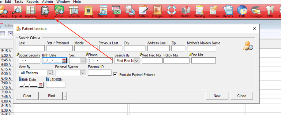 1. Search for the patient using the Patient Lookup by clicking the 'Chart' icon at the top of the screen: