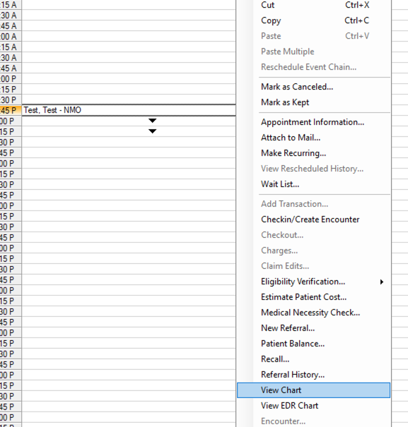 2. If the patient has an appointment scheduled in the appointment book, you can right click on the patient name in the appointment book then click 'View Chart':